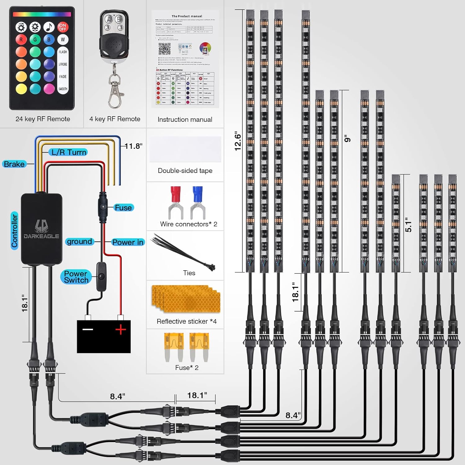 With 144 bright LEDs, this kit offers 16 million colors and 29 modes, including flashing, breathing, and jumping effects. It features brake light and turn signal functions for added safety. The IP68 waterproof design ensures durability.