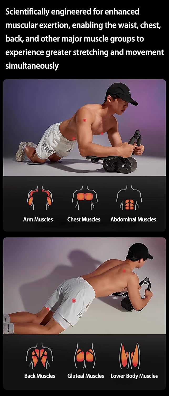 The 100MM anti-slip double wheels provide better stability and protect floors, while the triangular structure ensures safety for targeting abs, back, arms, chest, and shoulders. Soft sponge elbow supports reduce strain and enhance workout efficiency, helping you build six-pack abs quickly.