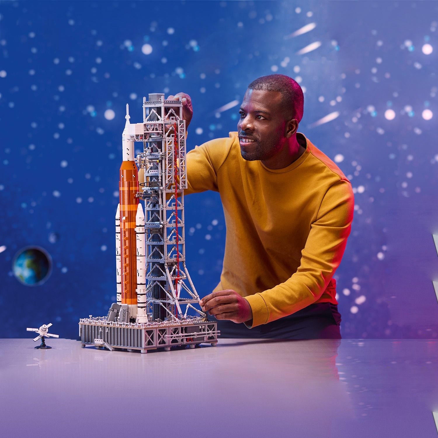All 3,601 pieces make up a launch tower that moves just like reality. The rocket comes apart in sections, with boosters that pop off like real ones. The spaceship on top has solar panels that fold out and cool details.