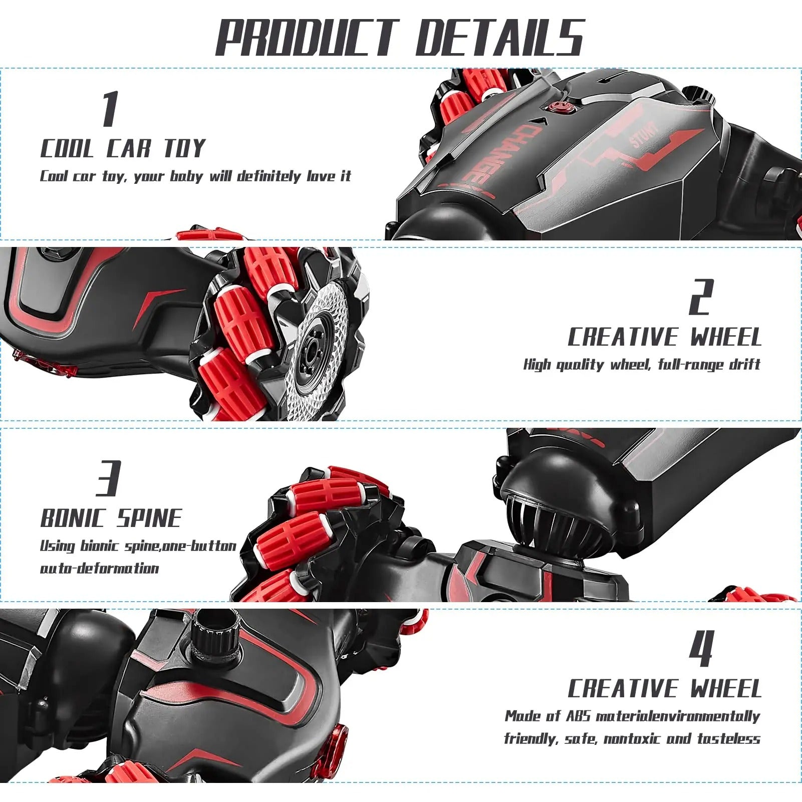 This stunt car operates using advanced gesture-sensing technology, responding to hand movements for smooth control. Its 4WD system and Mecunum wheels enable extreme stunts like 360° spins, and the one-key transformation adapts to various terrains effortlessly.