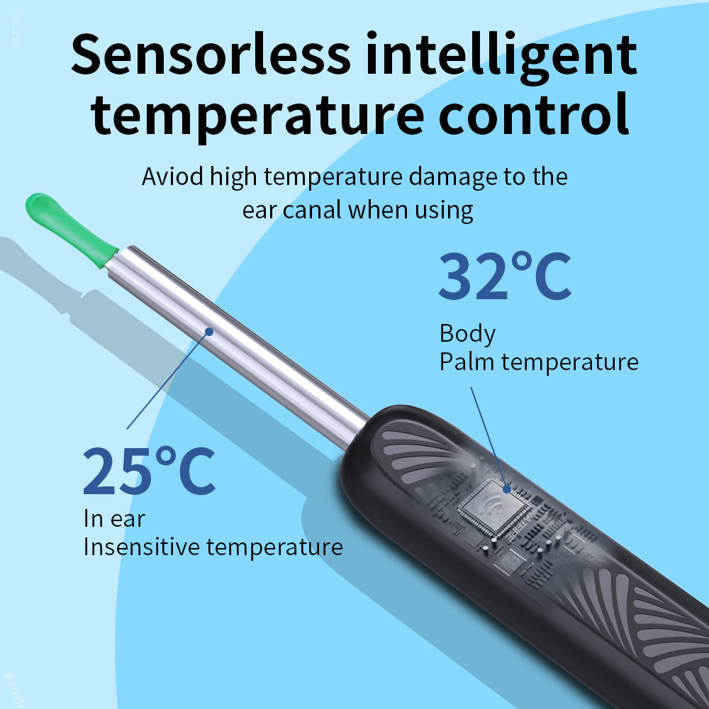 The HD camera streams live footage directly to your phone through WiFi. Six LED lights illuminate your ear canal while the temperature sensor ensures safe operation. The 360° lens captures complete views via the mobile app.