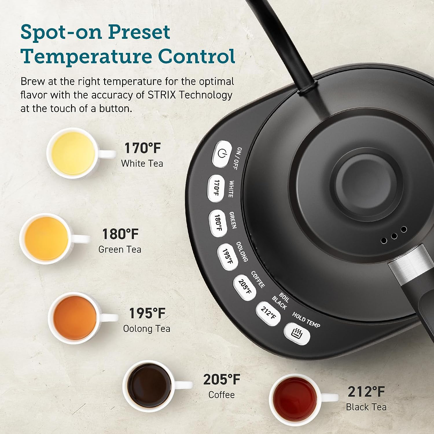 FIVE TEMPERATURE PRESETS: Choose from five accurate temperature presets to brew your coffee or tea perfectly every time.