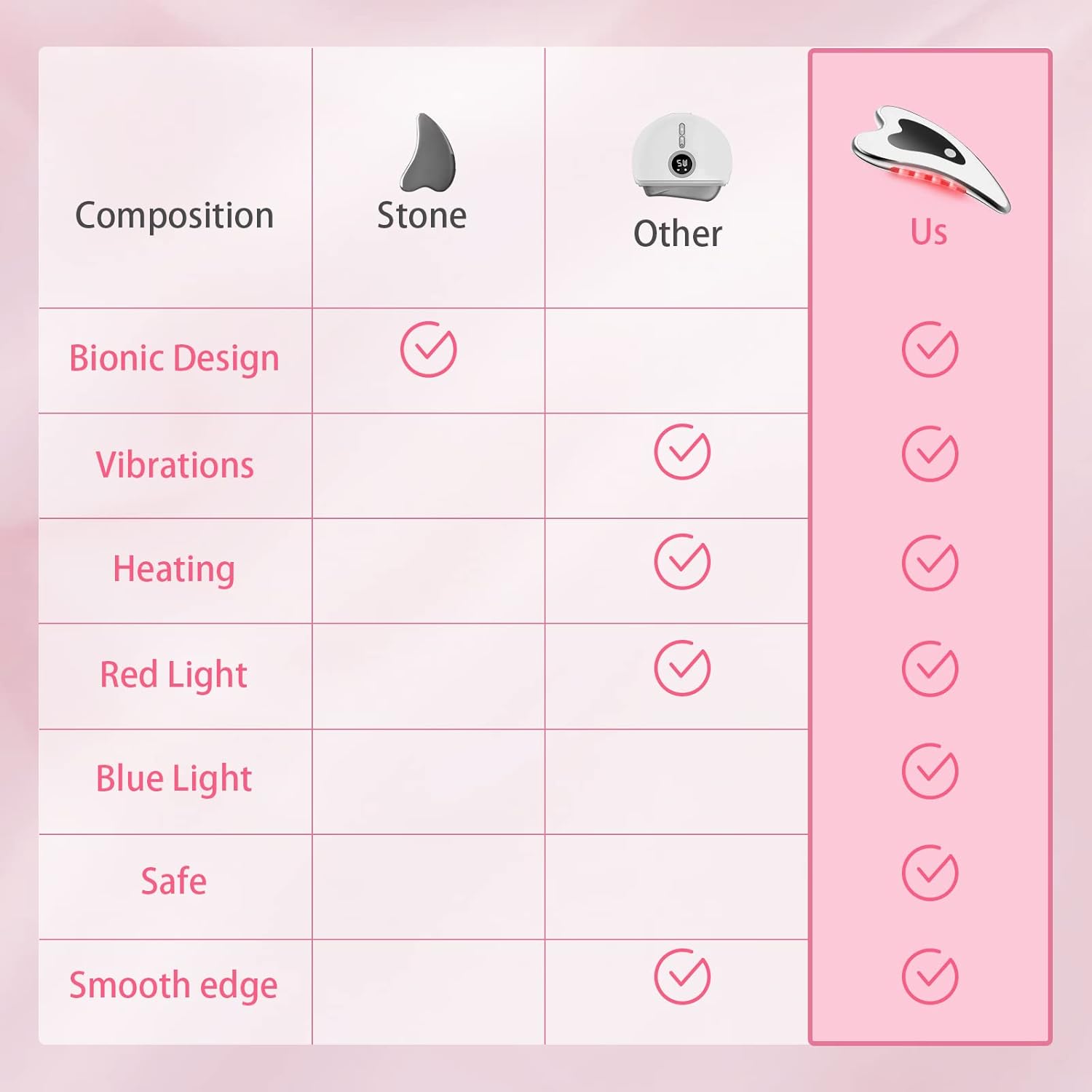 The gua sha massager is designed with a bionic edge to perfectly fit your facial contours, ensuring easy use on the jawline, cheeks, and body. It offers 4-in-1 functionality, delivering vibration, heat, red light, and blue light therapies.