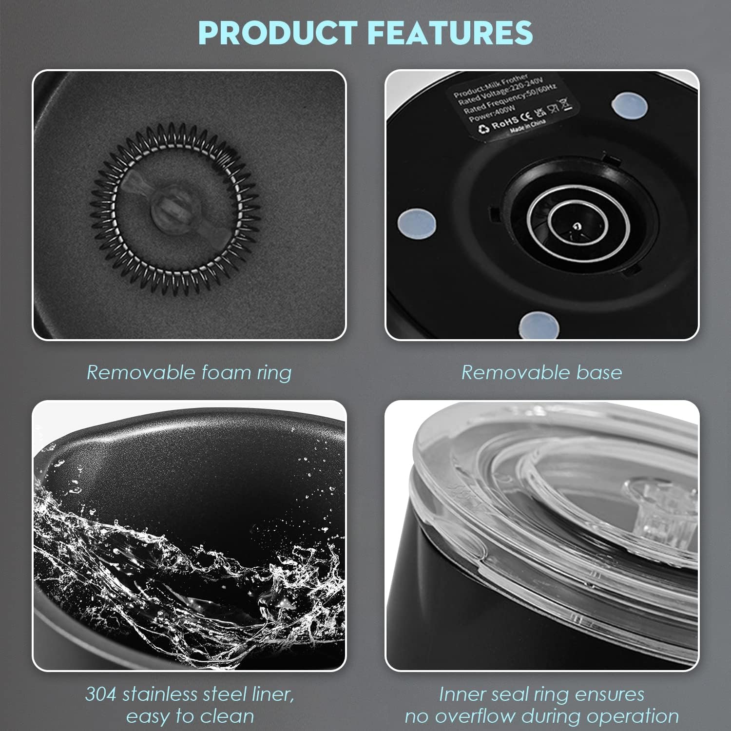 Our frother heats your milk to the perfect temp of 60ºC-65ºC in just 2-3 minutes, keeping all the nutrients and flavor intact. It can handle up to 350ml for heating or 160ml for frothing. Plus, it's made from durable, easy-to-clean 304 stainless steel.