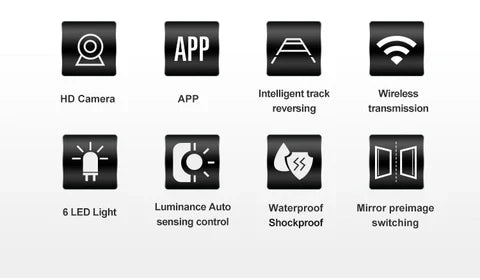 Method of operation: Attach the reversing camera to a DC 12-36V power source, such as a driving light or reverse light. The reversing camera will produce a WiFi signal (no Internet support) when the light power is turned on. Establish a WiFi connection, launch the app, and take pictures with the backup camera.