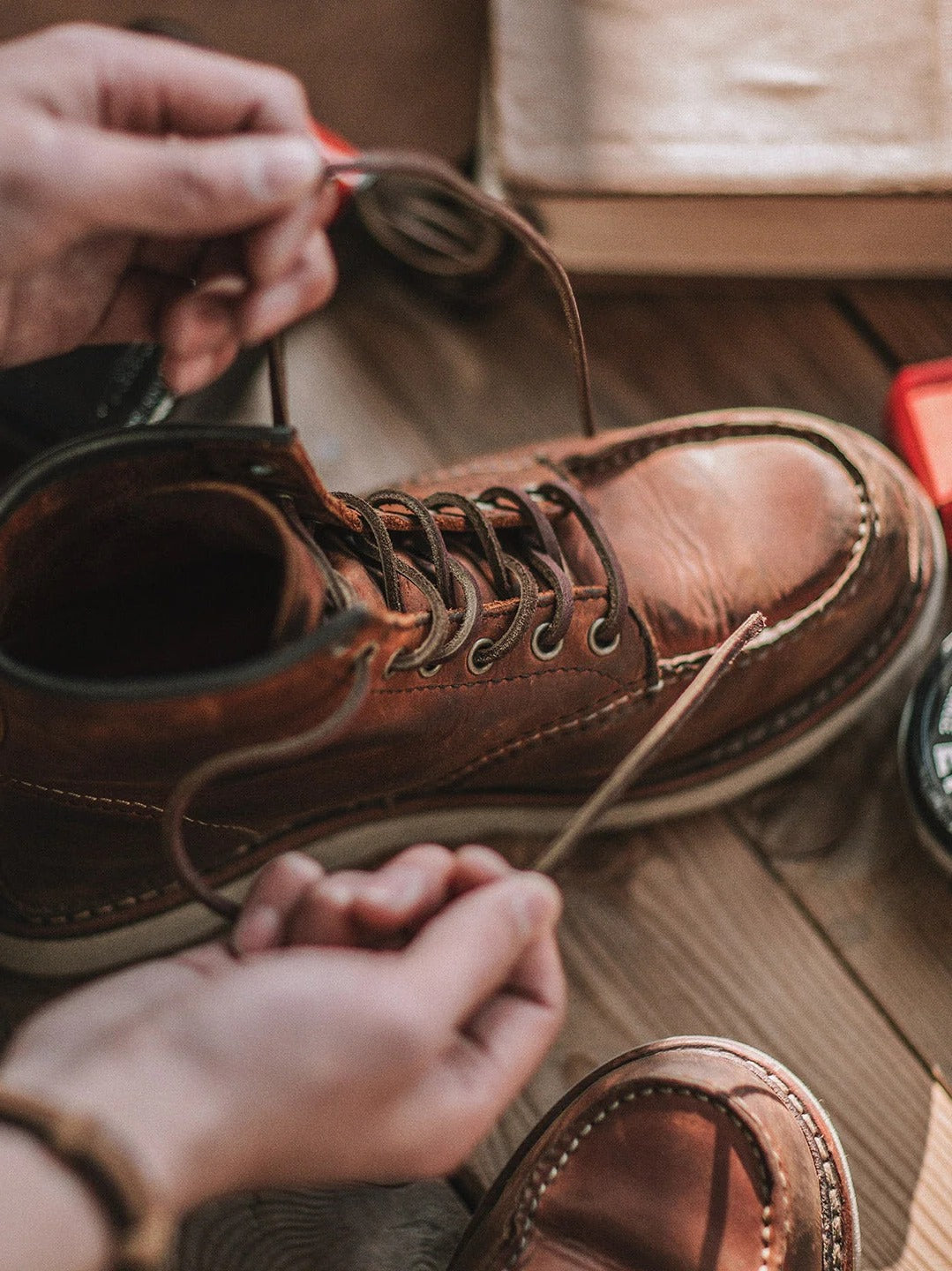 This classic hunting boot is retro and nostalgic with excellent texture. It is made of the top layer of oiled cowhide leather, also known as "crazy horse leather.". Crazy Horse leather has been popular since its appearance in the 1980s. The dark brown skin has a unique frosted touch and shows a rough and tough retro style.