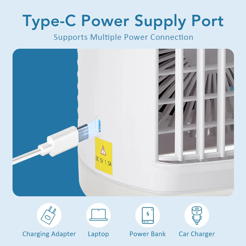 Beat the heat in style with this sleek and compact portable air conditioner that doubles as a humidifier and LED night light. Perfect for your home, office, or dorm, it delivers instant cooling and fresh mist with just a USB connection. Featuring dual ultrasonic misting technology, this high-performance portable air cooler transforms dry, hot air into a refreshing breeze while keeping humidity balanced for comfort.