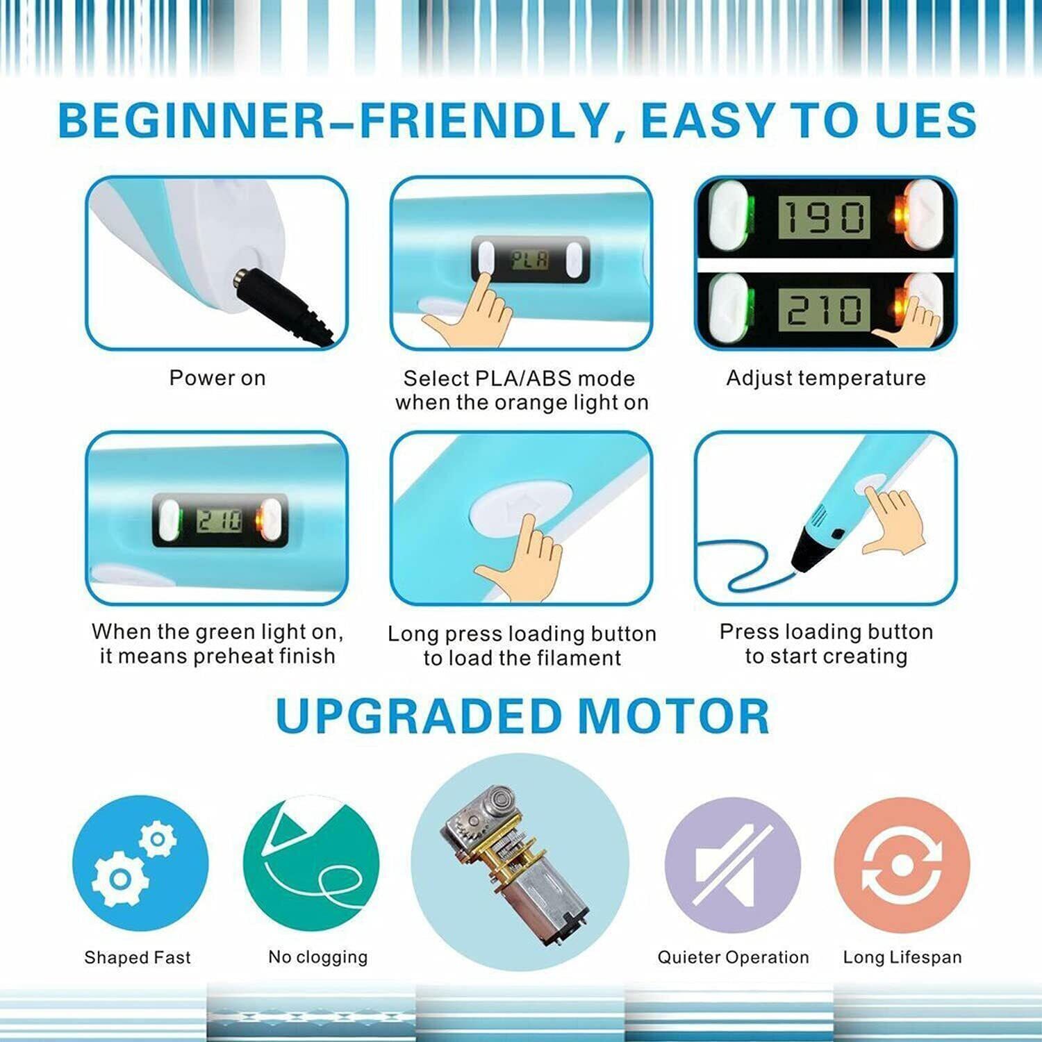 Appropriate for All Ages 3+: The ideal present for you, your children, or friends is this 3D pen. The optimum time for children to develop their potential is in their early years, and our 3D printing pen helps them practise their vision, attentiveness, imagination, and creativity. The ideal toy and tool for designers, architects, painters, and crafters who love to create and bring their ideas to life, it's also a terrific method for adults to decompress or develop interests.