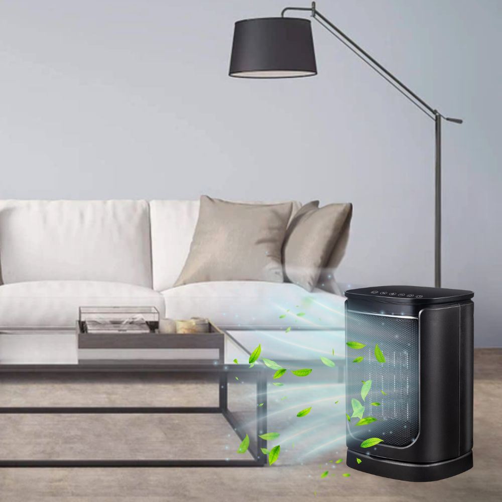 Color: black Cooling and heating mode: 1800 watts (high heat); 800 watts (low heat); 21 watts (cold air) Temperature range: 41°F- 95°F Wide range of oscillation: 70° Timer: 12 hours Voltage: 110-220V Display: LED With remote control: Yes Protection safety: V-0 retardant material, overheating protection, tip-over protection, fireproof material Product size: 24.5*17*14cm / 9.6*6.7*5.5 inches