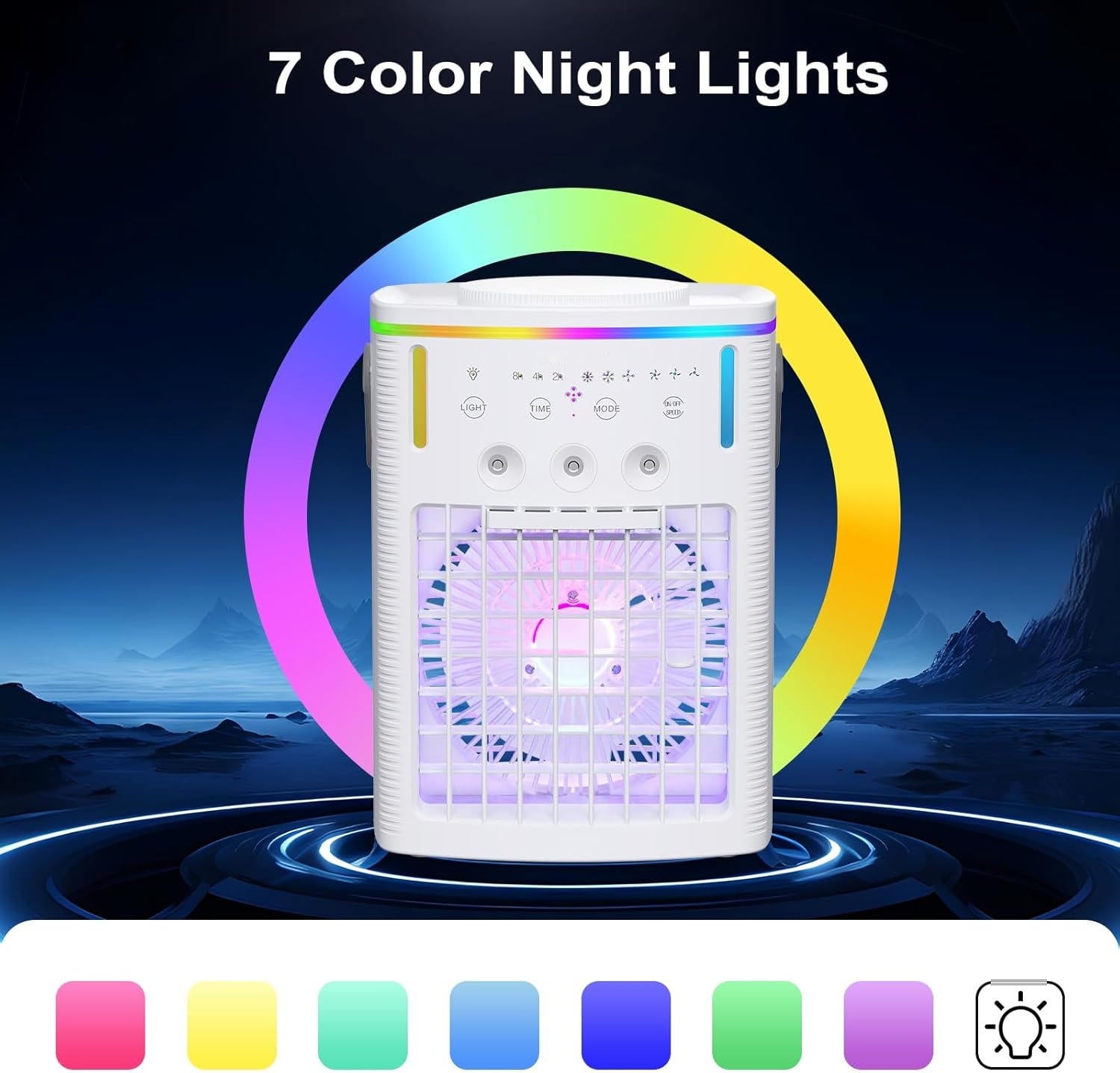 AMBIENT LIGHTING COMFORT: Seven soothing color options create perfect atmosphere while whisper quiet 50dB operation maintains peace.