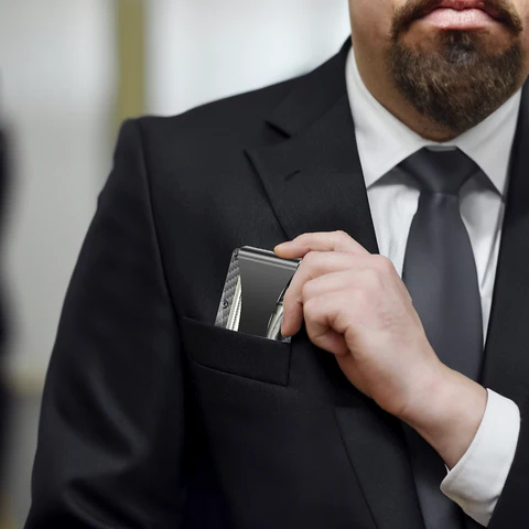 Just slide your cards and bills into the appropriate slots on the Money Clip Men's Carbon Fiber Credit Card Holder Metal Wallet. The money clip and elastic webbing keep everything neat and handy, while the RFID blocking feature makes sure your cards are safe.