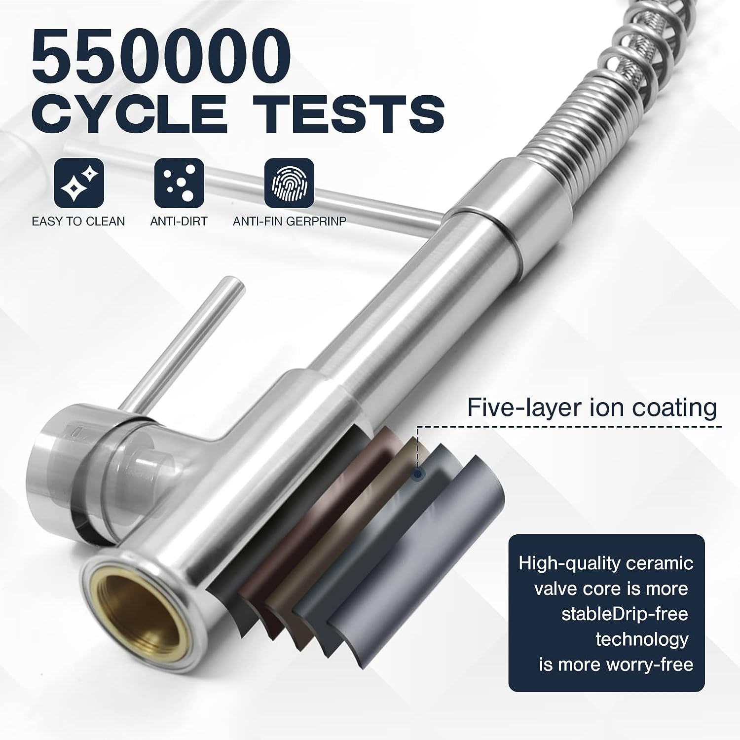 - LEAK-PROOF ASSURANCE: Our kitchen sink faucet features a high-quality ceramic valve core tested for over 500,000 leak-free cycles. With a double gasket seal at the nozzle-hose connection, it remains watertight even under high water pressure, ensuring a hassle-free experience.