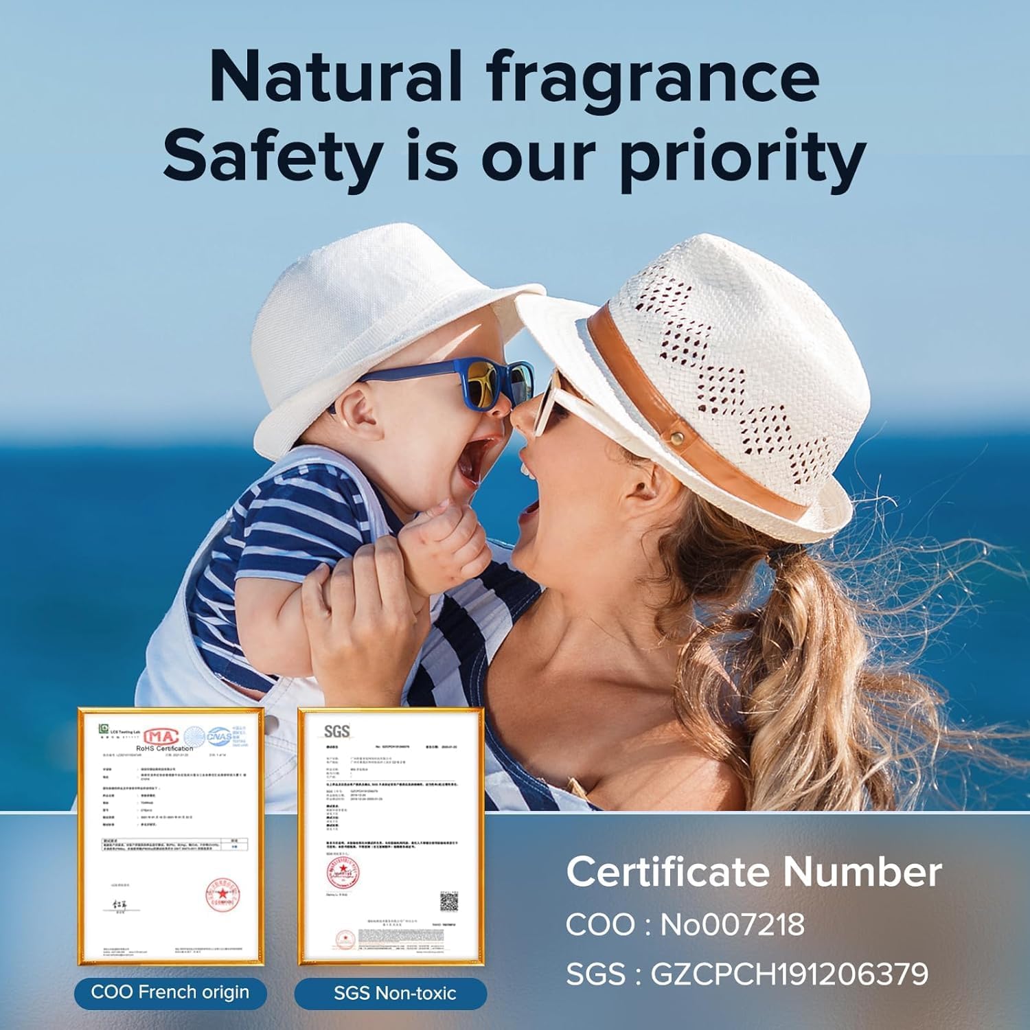 NATURAL FRAGRANCES AND SAFETY CERTIFICATION: Uses 100% natural, alcohol-free fragrances, certified non-toxic, ensuring safety for sensitive users including children and pregnant women.