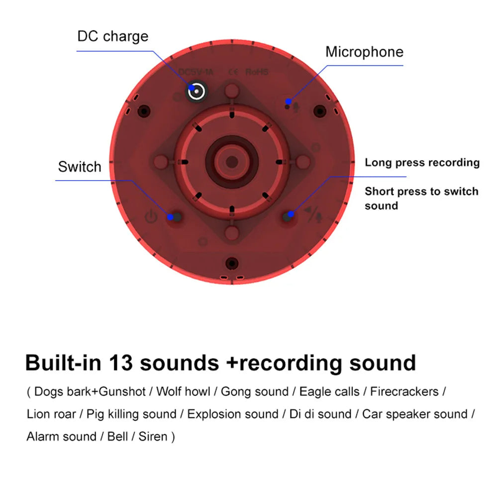 - Emits high-decibel alarms and 13 rotating sounds as a reliable bird deterrent
