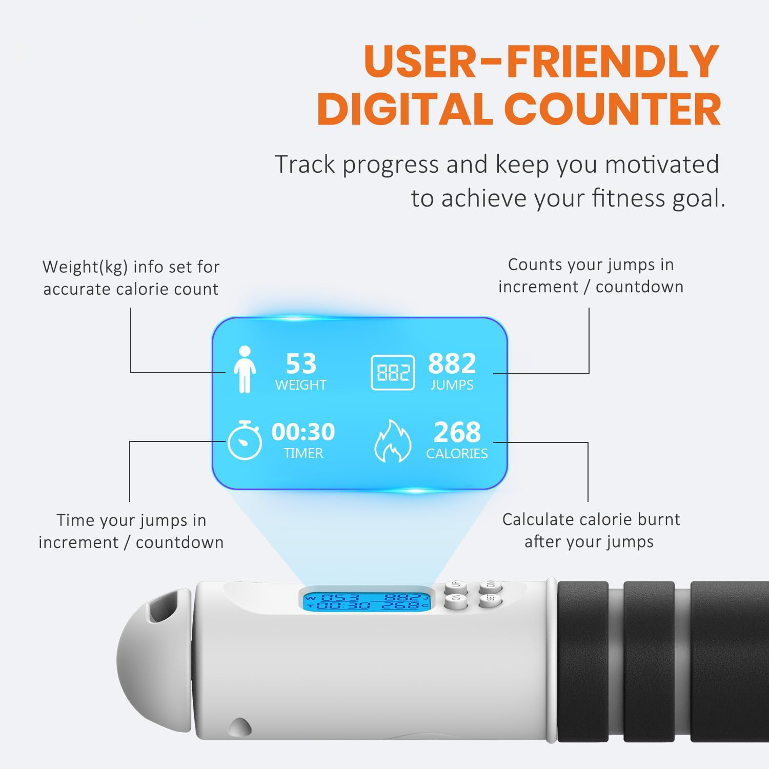 JUMP ROPE WITH COUNTER: HD LED display shows timer, weight, calories, and laps. Set your info, and it tracks everything accurately.