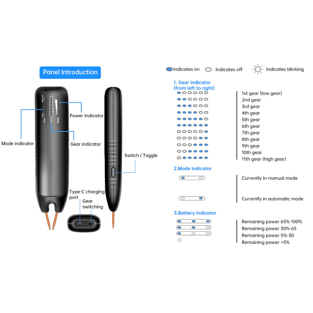 Press the side button for 2 seconds, then select from 11 power levels using the top control. The integrated system delivers 800A of precise welding current through detachable pins. Switch between manual and automatic modes for perfect control.