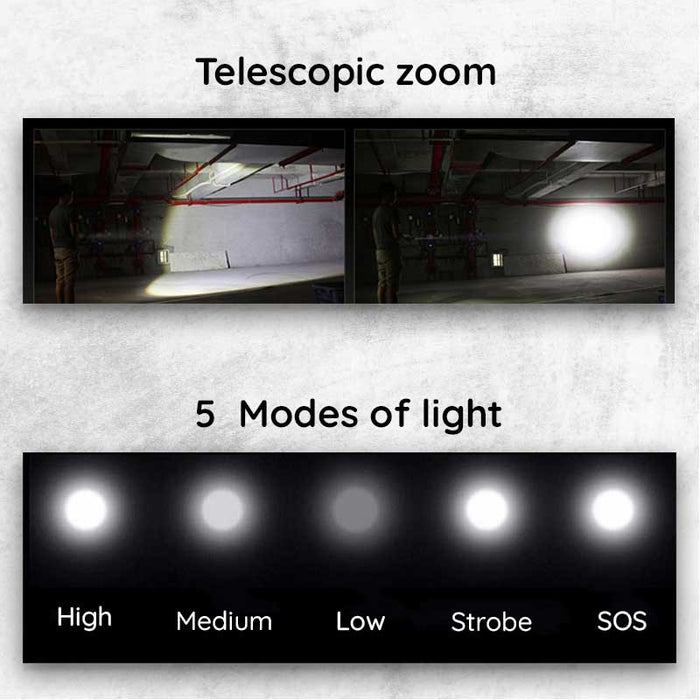 A telescopic zoom allows you to focus the beam of light on a specific spot or zoom out to illuminate a larger area.